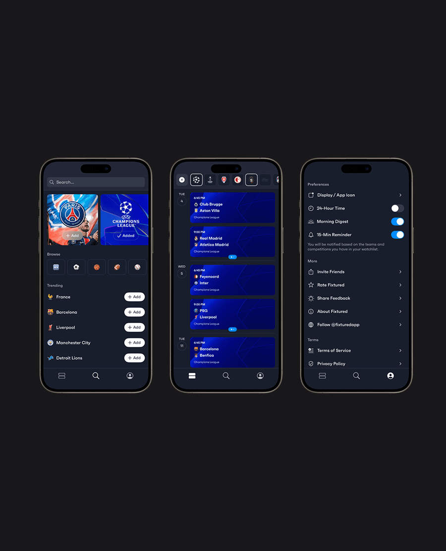 Fixtured is the sports calendar that finally brings order to your match-day chaos. Whether you're a Premier League diehard, NBA addict, or someone trying to track three leagues at once — Fixtured makes it effortless. Add your favorite teams and competitions, and get a clean, unified calendar view with all your upcoming matches. Bonus? Live scores, broadcast info (US/UK/FR), iOS widgets, daily digests, and customizable alerts. It’s like a personal assistant for sports fans — minus the annoying small talk.
